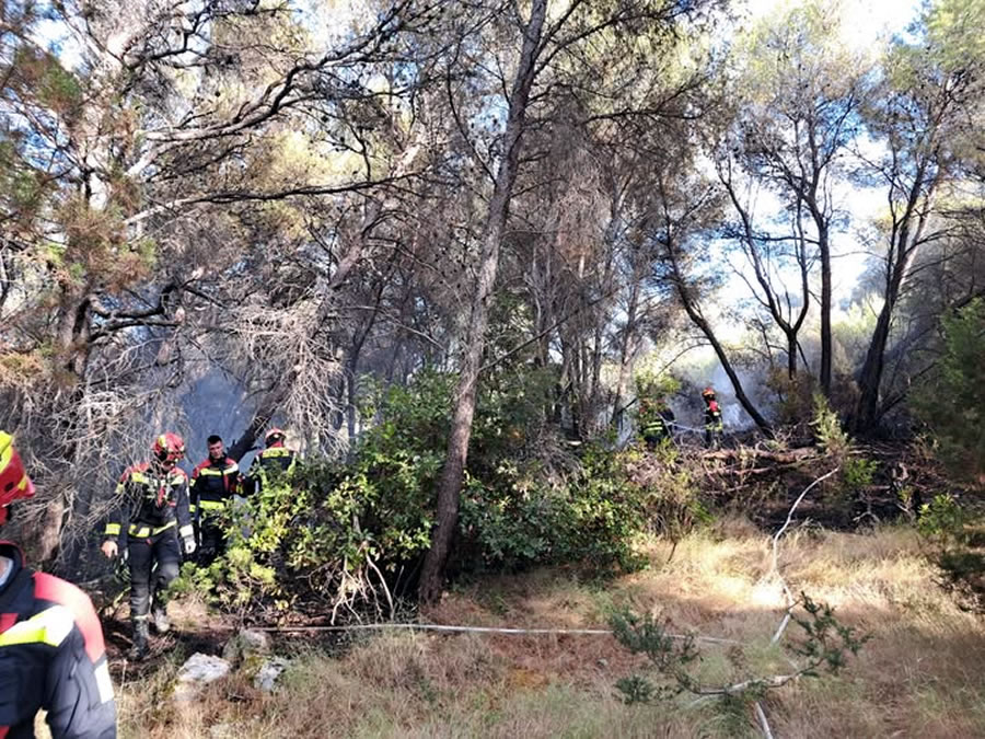 Opožarena površina 0,3 ha pretežito makije i niskog raslinja unutar guste borove šume.